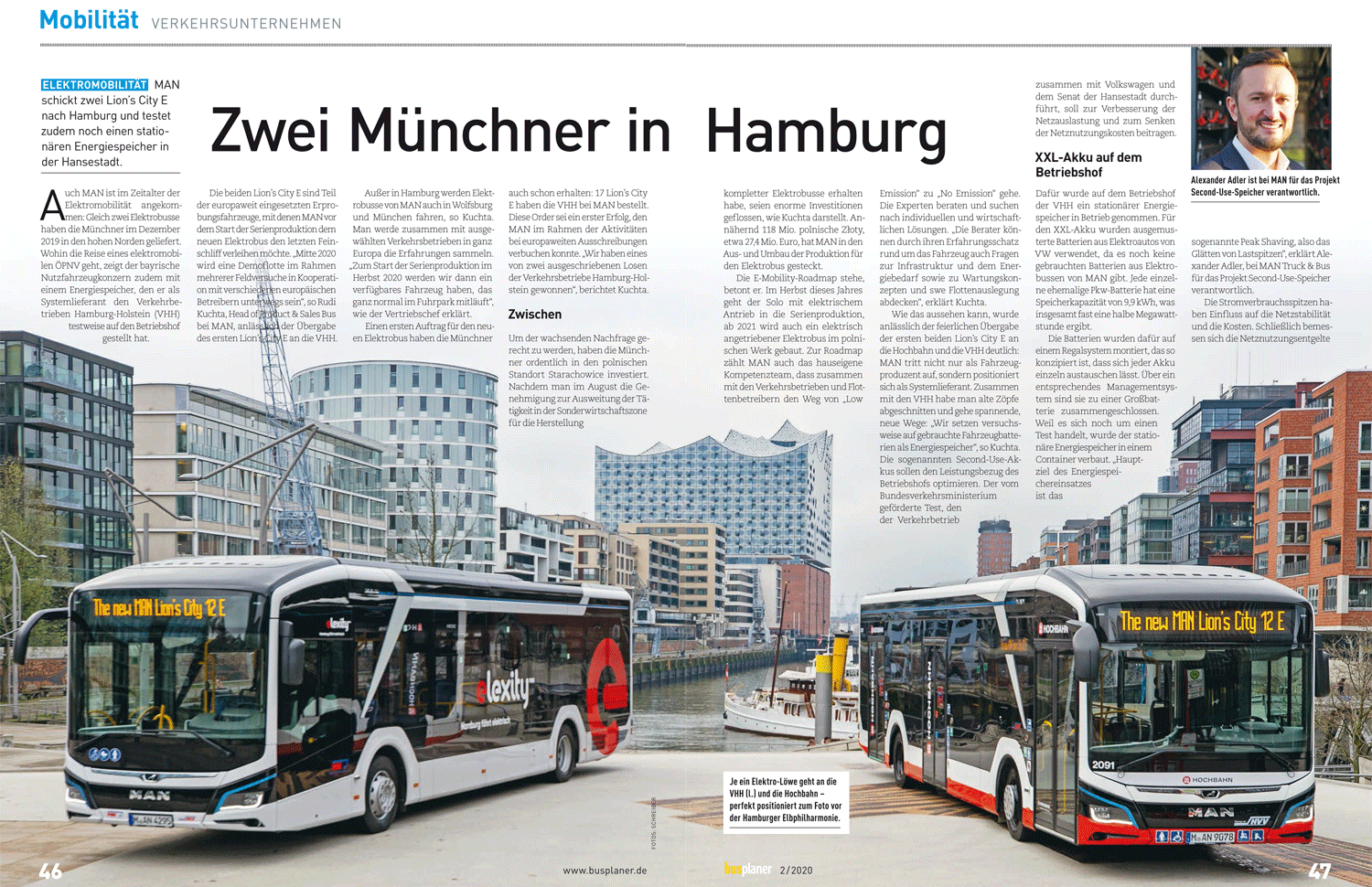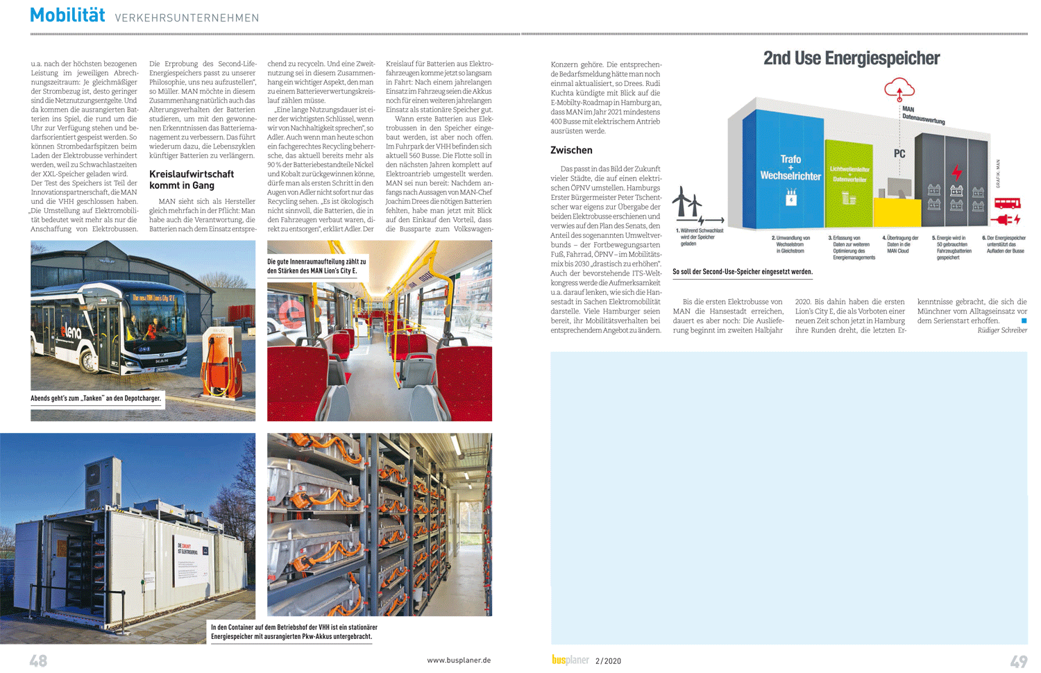 Busplaner 02/2020: 4-seitige Reportage Elektromobilität – MAN schickt die ersten beiden Lion’s City E in Hamburg auf die Straße und testet zudem einen stationären Energiespeicher für das zweite Leben der Bus-Batterien.